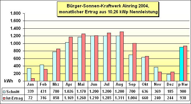 erneuerbaren Energieträgern aufgebaut werden", 01.01.2005 Solarertrag-2004 liegt mit 9629 kWh um 3,8% über dem Durchschnitt. Vorstand und Gesellschafter wünschen alle Förderern,